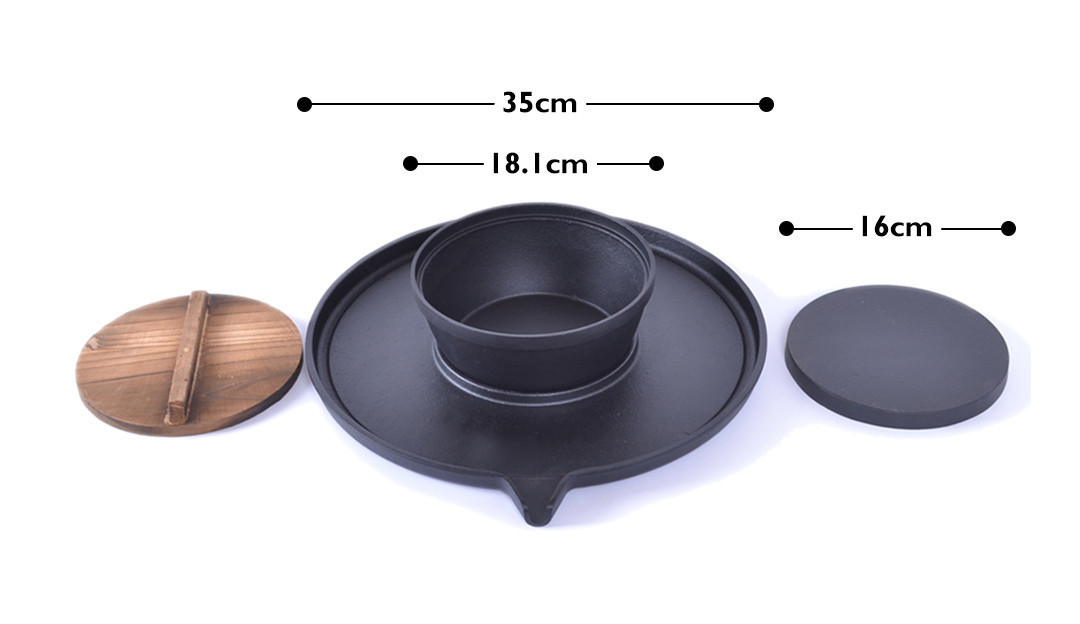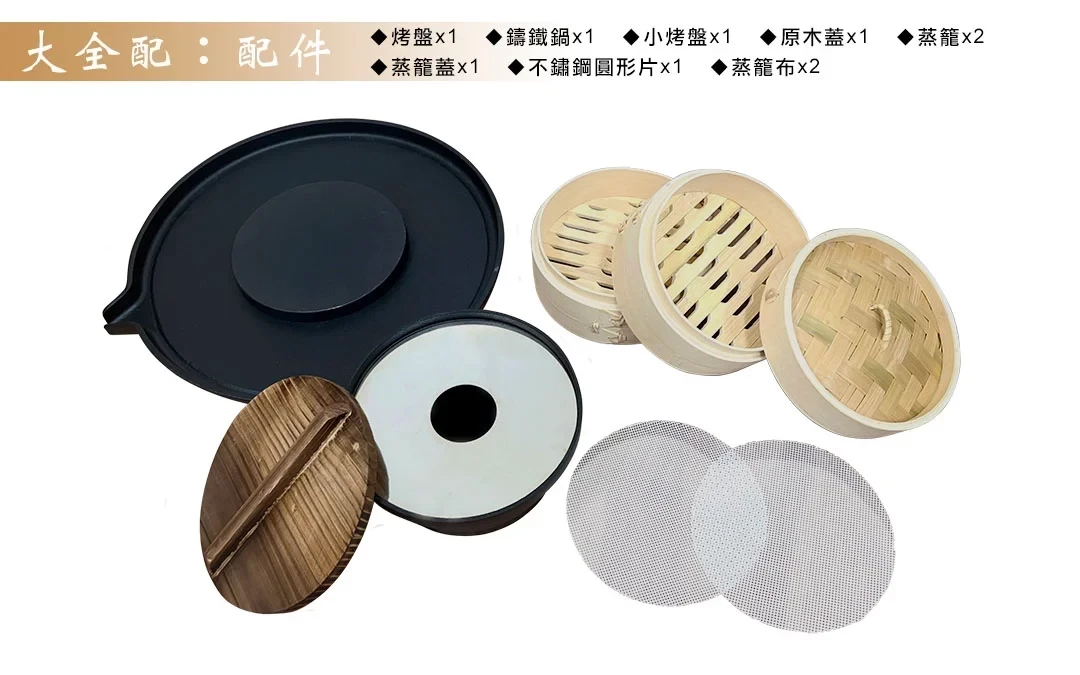 配件:烤盤x1+鑄鐵鍋x1+小烤盤x1+原木蓋x1+蒸籠x2+蒸籠蓋x1+不鏽鋼圓形片+蒸籠布x3