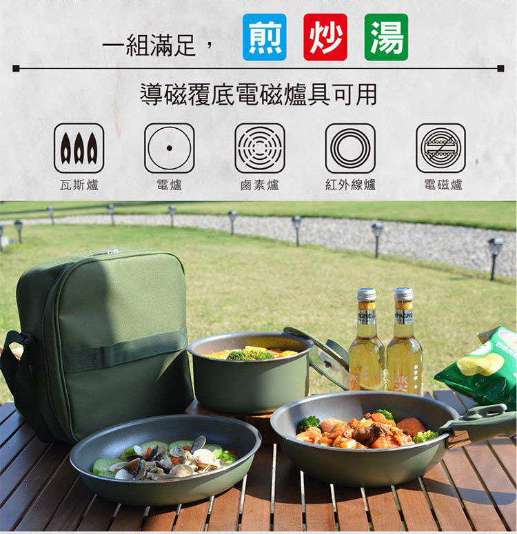 SADOMAIN 日本Daikin露營鍋具組24cm附收納袋 綠色/沙色/黑色 12360224/7/8