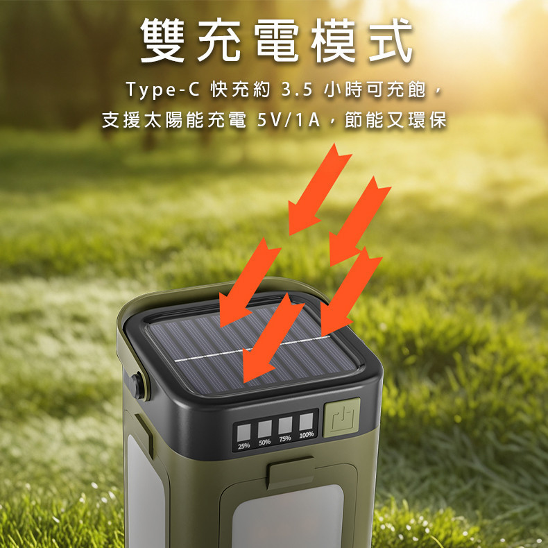 ◆ 雙充電模式:Type-C 快充約 3.5 小時可充飽,支援太陽能充電 5V/1A,節能又環保