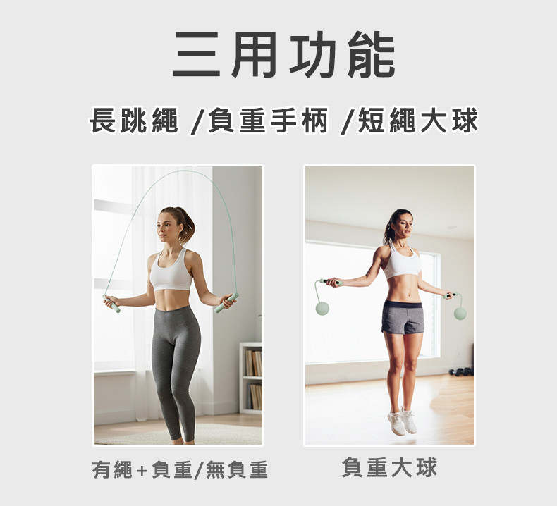 💡 三用功能:長跳繩 / 負重手柄 /短繩大球,可依需求調整!