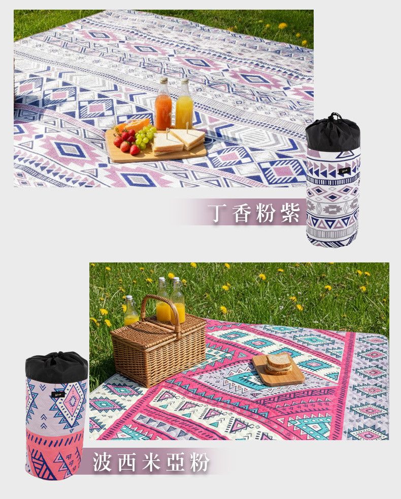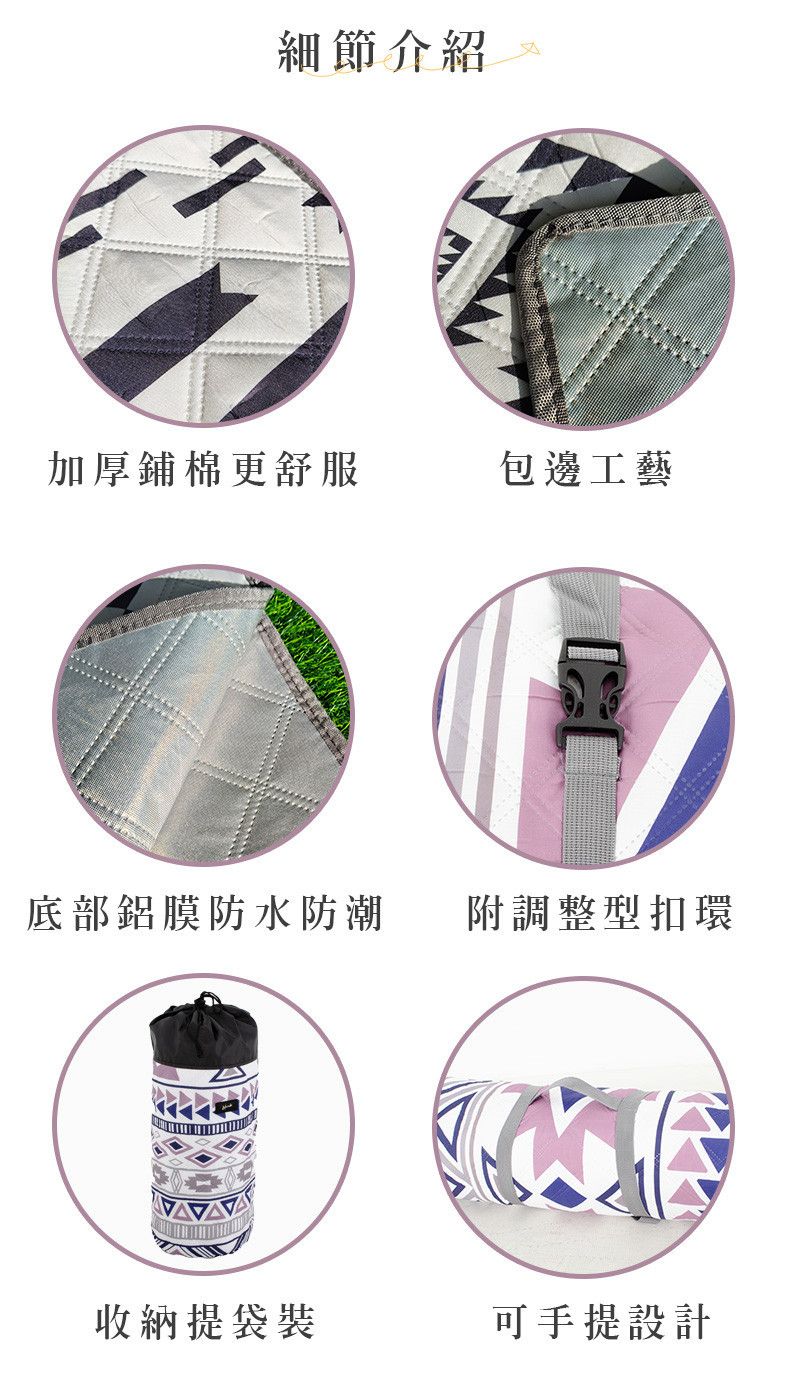 外層布料採用觸感舒適的印花春亞紡,花色飽和質感佳;內層鋪棉提升柔軟腳感;底層鋁膜隔絕濕氣、防潮耐用,即使草地、砂地也能保持乾爽。