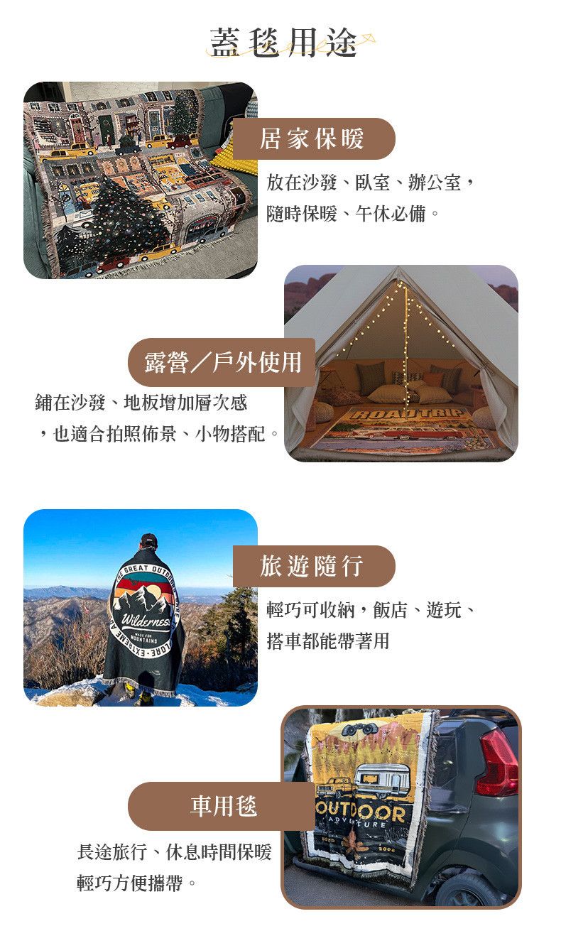 超大面積適用於 雙人床鋪、沙發蓋毯、午睡毯,也能作為 露營內帳鋪墊、野餐墊、戶外保暖毯。幾何美學圖案提升居家氛圍,不論放在房間、客廳、車上或帳篷內,都展現自然系生活風格。一毯多用,四季皆可使用。