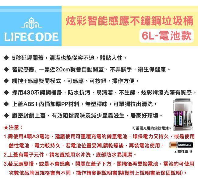 買一送一【LIFECODE】炫彩智能感應不鏽鋼垃圾桶(6L-電池款) 1432001